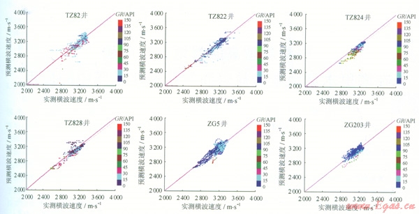 圖3是利用Xu—White模型法對塔中地區(qū)6口井的橫波曲線擬合的實驗結果。從圖3中可以看出: