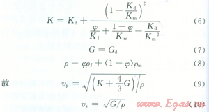 Xu—White模型首先用骨架和泥巖不同的縱橫直徑比以及其他有關參數(shù)來估算干巖石的體積模量和切變模量,再用孔隙中流體的性質(zhì)來計算含流體巖石的體積模量和切變模量。從測井密度資料和由Xu—White模型得出的體積模量和切變模量,便可導出巖石的縱、橫波速度,這就是Xu—White模型方法預測速度的基本原理。