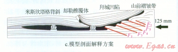 從實(shí)際地震剖面與物理模擬的結(jié)果對(duì)比圖(圖3-b、c)來看,該實(shí)驗(yàn)基本將阿瓦特段的構(gòu)造變形情況真實(shí)地再現(xiàn)了出來,物理模擬的構(gòu)造形態(tài)與地震剖面基本一致:鹽下發(fā)育4排疊瓦逆沖斷層,與地震剖面一致;物理模擬剖面斷層傾角約30°,地震剖面斷層傾角40°,二者基本吻合。該實(shí)驗(yàn)在邊界條件的設(shè)計(jì)上和構(gòu)造變形的過程上與真實(shí)情況基本一致,符合相似性原則,可以作為對(duì)該地區(qū)構(gòu)造解釋的有效證據(jù)。