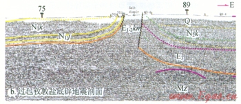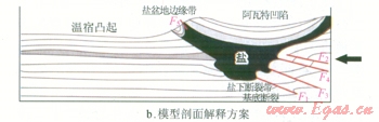 在鹽的滑脫作用下,鹽上層變形與鹽下層變形不協(xié)調(diào)。鹽上層主要表現(xiàn)為幅度很小的向斜盆地和推覆距離很大的逆沖推覆體,鹽下前緣斷層在擠壓作用下即開始形成,直至擠壓最終結(jié)束,始終在活動(dòng)。而鹽上負(fù)載則在鹽的滑脫作用下推覆至鹽盆地南邊的硬性地層之上,并由于鹽的聚集作用和基底的抬升作用,鹽上