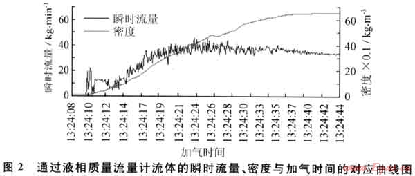 從圖2中可以看到加氣機(jī)從加氣開始,瞬時(shí)流量快速波動(dòng)上升,而密度以一定斜率緩慢上升。從13:24:10開始加氣到13:24:35密度趨于穩(wěn)定,約有20s時(shí)間流量計(jì)流過的介質(zhì)處于氣液兩相流狀態(tài)。加氣機(jī)通過控制控制閥1和控制閥2的動(dòng)作順序可以有效避免由于測(cè)量介質(zhì)存在氣液兩相而造成的計(jì)量不準(zhǔn)問題,具體工作原理為:當(dāng)加氣機(jī)開始加氣時(shí),控制閥1關(guān)閉,控制閥2打開,此時(shí)流量計(jì)測(cè)量流體狀態(tài),但不參與計(jì)量;當(dāng)流體狀態(tài)達(dá)到測(cè)量要求時(shí),控制閥2關(guān)閉,同時(shí)打開控制閥1,測(cè)試流量計(jì)開始計(jì)量,完成加注任務(wù)。