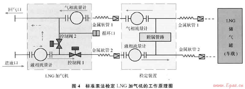考慮到稱重法的弱點(diǎn),現(xiàn)場(chǎng)檢定LNG加氣機(jī)優(yōu)先選用標(biāo)準(zhǔn)表法。根據(jù)實(shí)際操作過程,標(biāo)準(zhǔn)表法又可進(jìn)一步分為啟停法和動(dòng)態(tài)法。標(biāo)準(zhǔn)表法檢定LNG加氣機(jī)的工作原理圖如圖4所示。