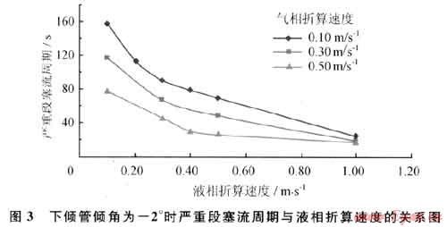 圖3為下傾管傾角為-2°時嚴重段塞流周期與液相折算速度的關系圖。從圖3可以看出嚴重段塞流周期隨液相折算速度的增大而減小。實驗顯示形成嚴重段塞流時下傾管為分層流。液相折算速度增大時,下傾管持液率增加,氣相空間相應減小,相同時間內氣相壓力增加值變大,因此嚴重段塞流周期變短。同時從圖3還可以看出嚴重段塞流周期隨氣相折算速度的增大而減小,當氣相折算速度增加時,下傾管內的氣體壓力上升速度增加,下傾管內的氣相壓力值達到立管底部所受最大靜水壓力的時間變短,因此嚴重段塞流周期變短。