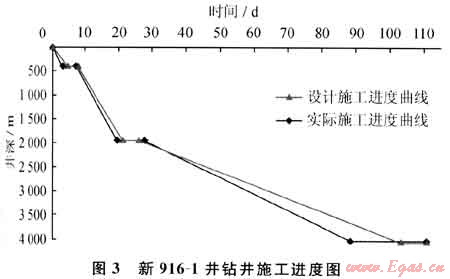 從本井時(shí)效分析結(jié)果可知,全井鉆井總臺(tái)時(shí)為2121.5h,臺(tái)月效率為1366.10m/臺(tái)月,高于設(shè)計(jì)值15.94%;純鉆率為57.31%,高于沒(méi)計(jì)值15.26%;全井平均鉆速為3.31m/h,高于設(shè)計(jì)值0.61%。事故率為0,鉆井周期為88.4d,平均機(jī)械鉆速為3.31m/h,實(shí)現(xiàn)了以須四段為目的層的4000m定向深井105d完鉆的提速奮斗目標(biāo),并較提速目標(biāo)提前16.60d,創(chuàng)造了川西地區(qū)4000m定向深井鉆井周期最短紀(jì)錄(施工進(jìn)度如圖3所示)。