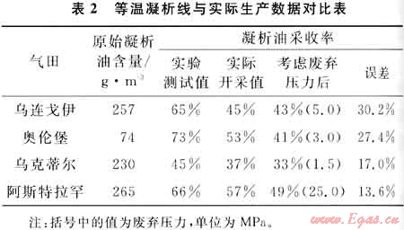 俄羅斯的烏連戈伊、奧倫堡、烏克蒂爾、阿斯特拉罕等凝析氣田比較的結(jié)果值得重視,飽和的油環(huán)凝析氣藏差別很大,不飽和的差別要小些,分析原因有[4]:①測(cè)等溫凝析線時(shí)放棄速度過快會(huì)造成油氣相態(tài)不平衡,從而帶來測(cè)試誤差;②多孔介質(zhì)的存在使采出凝析油量減少;③地層水(含凝析水)對(duì)相態(tài)的影響,一般影響較小;④凝析氣層中剩余原油飽和度的影響,一般影響較大。其對(duì)比結(jié)果見表2。