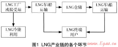 LNG產(chǎn)業(yè)是典型的鏈條產(chǎn)業(yè),從上游的天然氣開采與生產(chǎn)、天然氣液化、LNG貿(mào)易運(yùn)輸?shù)絃NG終端利用,形成了完整的產(chǎn)業(yè)鏈。[3]隨著國(guó)內(nèi)經(jīng)濟(jì)的快速發(fā)展,制造業(yè)及社會(huì)消費(fèi)對(duì)石油需求日益增大。國(guó)家一年多次調(diào)整油價(jià),天然氣與石油等熱值價(jià)格比一直在擴(kuò)大。受供求關(guān)系及市場(chǎng)預(yù)期的影響,進(jìn)口和國(guó)產(chǎn)LNG產(chǎn)能將迅速放大,LNG產(chǎn)業(yè)開始進(jìn)入快速發(fā)展的進(jìn)程。LNG產(chǎn)業(yè)的發(fā)展同時(shí)帶動(dòng)了物流業(yè)、深冷設(shè)備制造業(yè)、天然氣發(fā)動(dòng)機(jī)制造業(yè)等國(guó)內(nèi)多行業(yè)的發(fā)展。圖1描述了國(guó)內(nèi)LNG產(chǎn)業(yè)鏈的各個(gè)環(huán)節(jié)。