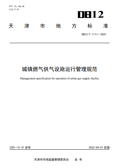 天津地標(biāo):城鎮(zhèn)燃?xì)夤庠O(shè)施運(yùn)行管理規(guī)范DB12/T 1111—2021